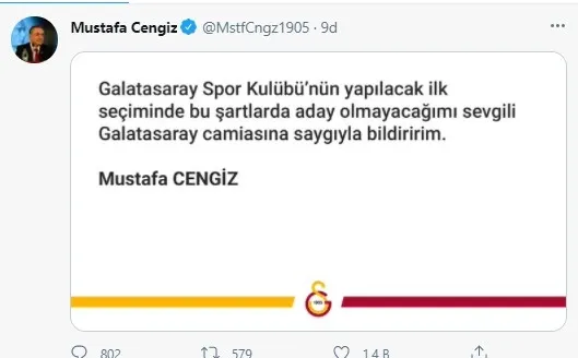 Galatasaray Spor Kulübü'nün yapılacak ilk seçiminde bu şartlarda aday olmayacağımı sevgili Galatasaray camiasına saygıyla bildiririm.