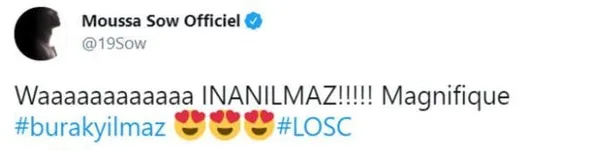 Uzun yıllar Fenerbahçe forması giyen ve sarı lacivertlilerden önce Lille formasıyla gol krallığı yaşayan Moussa Sow, Burak Yılmaz'ın attığı ikinci gol sonrası sosyal medya hesabından paylaşımda bulundu. Sosyal medya hesabından paylaşım yapan Moussa Sow, Burak Yılmaz için "İnanılmaz ve muhteşem" ifadelerini kullandı.