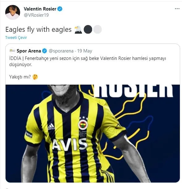 Bu sezon Sporting'den kiralık olarak Beşiktaş forması giyen ve şampiyonluğun mimarlarından biri olan Valentin Rosier için Fenerbahçe iddiası ortaya atıldı… Yıldız oyuncu ise hakkında çıkan Fenerbahçe haberlerini sosyal medya hesabından yalanladı. Fransız oyuncu hakkında çıkan haberin linkini paylaştı ve "Kartallar, Kartallarla uçar" yorumunu yaptı.