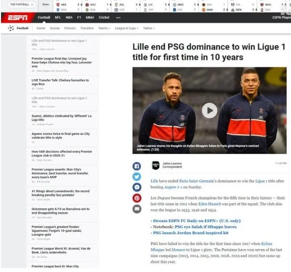 Lille, PSG'nin saltanatına son verdi ve 10 sene aradan sonra Ligue 1'de şampiyon oldu. Son 5 maçta 6 gol atan Burak Yılmaz hücum hattında sansasyonel bir performans sergileyerek şampiyonlukta büyük pay sahibi olmayı bildi. (ESPN)