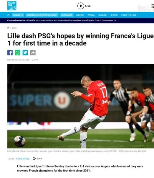 Lille, Angers deplasmanında aldığı 2-1'lik galibiyetle PSG'yi tahtından ederek şampiyon oldu! Takımda sezonun en iyisi olan 35 yaşındaki Burak Yılmaz ve 21 yaşındaki Kanadalı yıldız David'in golleriyle Lille, 2010/11 sezonundan bu yana ilk şampiyonluğa uzandı. (BBC Sport)