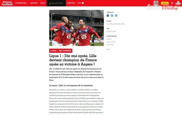 Lille, 2-1'lik Angers zaferi sonrası 2011'den bu yana ilk kez şampiyonluğa ulaştı. PSG'nin Brest deplasmanındaki 2-0'lık galibiyetine rağmen ligi bir puan farkla ilk sırada tamamlayan Lille'de galibiyet golleri David ve bu sezon 16 gole ulaşan Burak Yılmaz'dan geldi. (Ligue1.com)