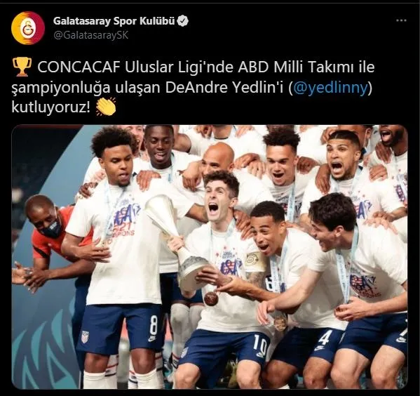 ABD Milli Takımı ile CONCACAF Uluslar Ligi'nde şampiyon olan Yedlin, G.Saray'ın Twitter hesabından yayınlanan bir mesajla tebrik edildi.