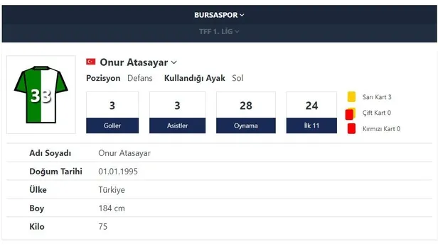 Geçtiğimiz sezon Bursaspor formasıyla TFF 1.Lig'de 31 maça çıkan Onur Atasayar, bu karşılaşmalarda 3 gol, 5 asistle 8 gole direkt katkı sağladı.
