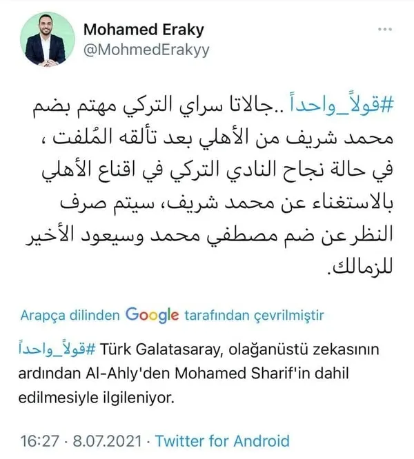 Mısır basınında yer alan iddialara göre Galatasaray hücumun her bölgesinde oynayabilen 25 yaşındaki futbolcunun transferi için resmi girişimlere başladı. El Ahly ile 2024 yılına kadar sözleşmesi bulunan Sherif'in Transfermarkt'a göre piyasa değeri 1.8 milyon Euro.