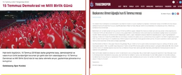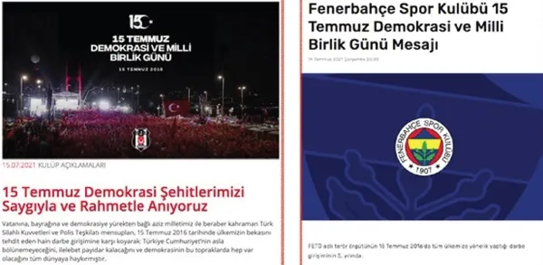 Fenerbahçe, Beşiktaş, Trabzon ve Galatasaray başta olmak üzere birçok Türk kulübü de 15 Temmuz için birlik ve beraberlik mesajı yayınladı.