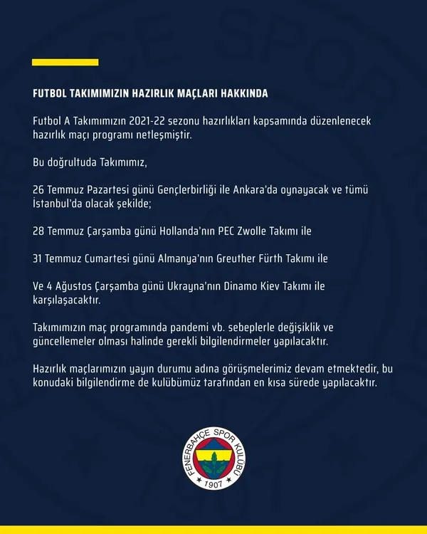 Fenerbahçe'nin hazırlık maçı programı belli oldu. Açıklamada "Takımımız 26 Temmuz Pazartesi günü Gençlerbirliği ile Ankara'da oynayacak ve tümü İstanbul'da olacak şekilde; 28 Temmuz'da Zwolle ile 31 Temmuz'da Greuther Fürth ile, 4 Ağustos'ta Dinamo Kiev ile karşılaşacaktır" ifadelerine yer verildi.