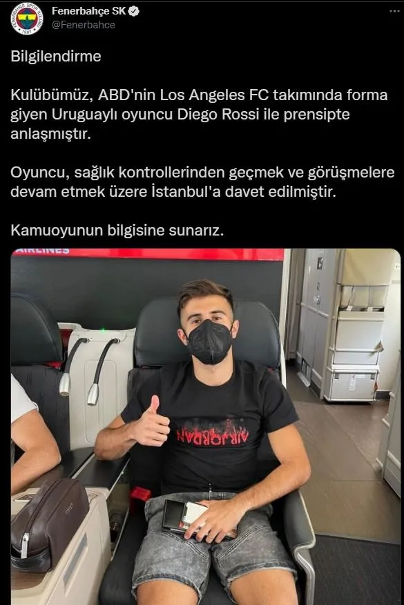 Sarı-lacivertli ekipten konuyla ilgili yapılan açıklamada, "Kulübümüz, ABD'nin Los Angeles FC takımında forma giyen Uruguaylı oyuncu Diego Rossi ile prensipte anlaşmıştır. Oyuncu, sağlık kontrollerinden geçmek ve görüşmelere devam etmek üzere İstanbul'a davet edilmiştir" ifadeleri kullanıldı.