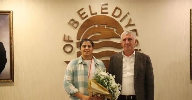 Başkanlık makamında Busenaz Sürmeneli ile sohbet eden Başkan Sarıalioğlu, Busenaz Sürmeneli'ye reşat altını takdiminde bulundu. Of Belediye Meclis Üyesi Yasemin Hacıefendioğlu ise Sürmeneli'ye çiçek takdiminde bulundu.