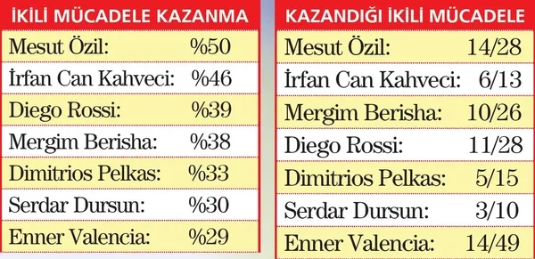 Mesut Özil fizik gücü eksik oludğu için eleştiriliyor. Ancak yıldız futbolcu, ikili mücadele kazanma istatistiğinde takım arkadaşlarını geride bıraktı.