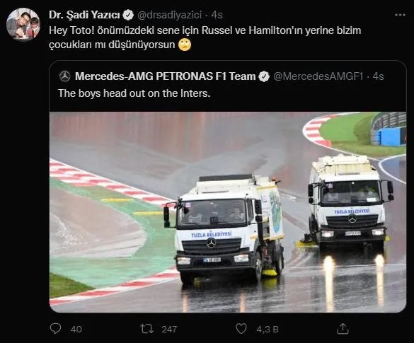 Başkan Yazıcı da Mercedes takımının Ceo'su Toto Wolff'e seslenerek;" Hey Toto! önümüzdeki sene için Russel ve Hamilton'ın yerine bizim çocukları mı düşünüyorsun" dedi. Başkan Yazıcı'nın bu paylaşımı sosyal medyada birçok kullanıcı tarafından paylaşıldı.