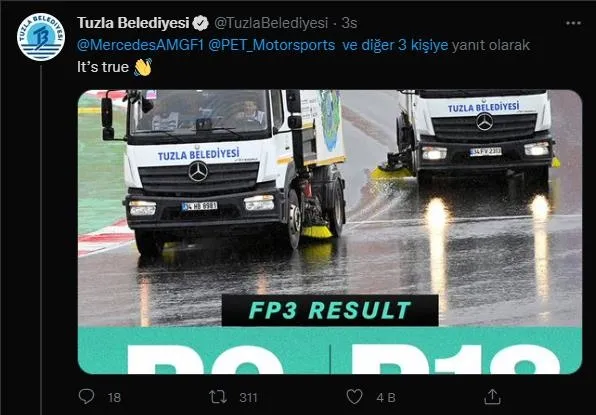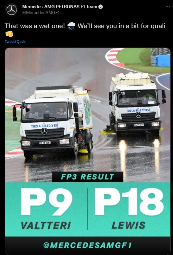 Formula 1'in son şampiyon takımı Mercedes'in antrenman seansında etkili olamayan Hamilton ve Bottas için Tuzla Belediyesi'nin Yol Süpürme Araçları'nın görselini kullanması sosyal medyada çok konuşuldu.