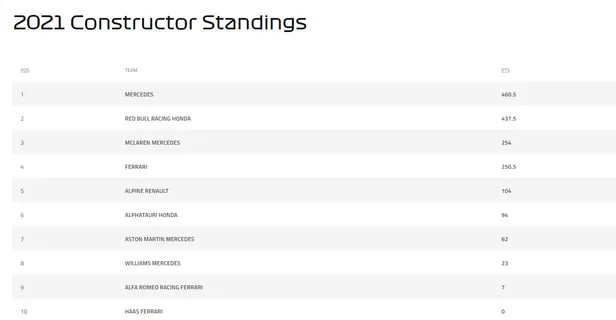 FORMULA 1 2021 DÜNYA ŞAMPİYONASI'NDA TAKIMLARDA PUAN DURUMU