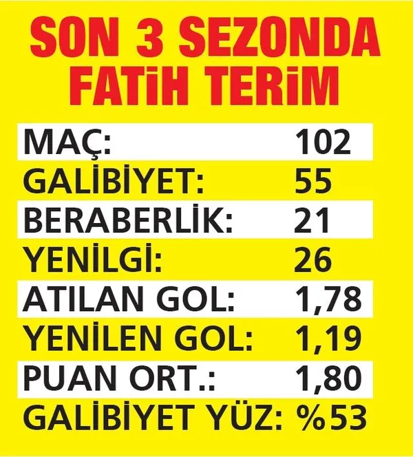Beşiktaş yenilgisi sonrası eleştirilen Fatih Terim 2019-2020 sezonuna kadar Galatasaray’ın başında çıktığı 434 maçta 2,11 gol, 2.05 puan ortalaması ve %61 galibiyet yüzdesi yakalamıştı. Ancak son 3 sezonda tecrübeli hocanın bütün istatistikleri aşağı doğru hızla inmeye başladı... Gol ortalaması 1,78'e gerilerken, puan ortalaması 1,80, galibiyet yüzdesi de 53'te kaldı.