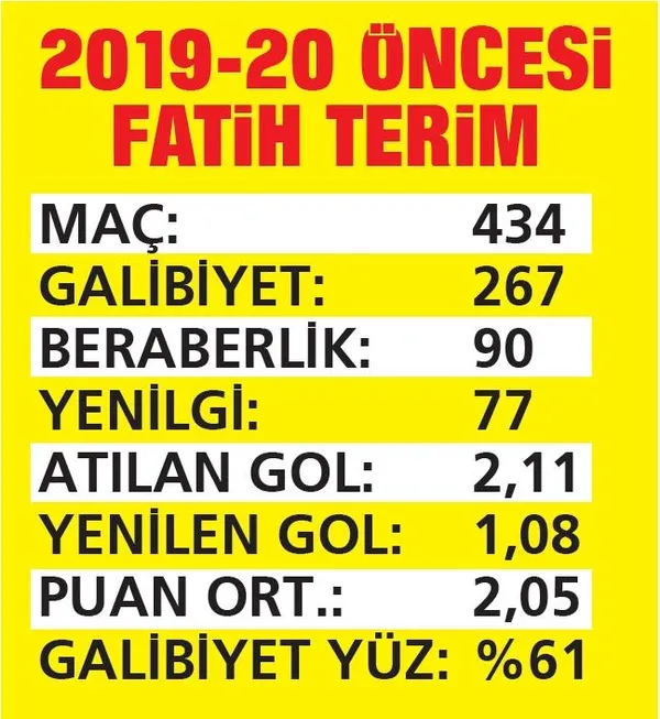 Beşiktaş yenilgisi sonrası eleştirilen Fatih Terim 2019-2020 sezonuna kadar G.Saray'ın başında çıktığı 434 maçta 2,11 gol, 2.05 puan ortalaması ve %61 galibiyet yüzdesi yakalamıştı.