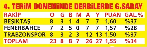 Galatasaray, Beşiktaş ve Trabzonspor'a karşı oynadığı 16 maçta 8 kez sahadan zaferle ayrıldı. Cimbom, Fenerbahçe önünde 7 derbide 2 kez gülerken, ezeli rakibine bu süreçte hiç yenilmeyerek önemli bir istatistiğe imza attı.