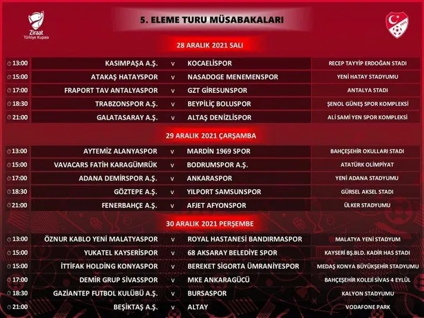 Turkuvaz Medya'nın yayıncısı olduğu Ziraat Türkiye Kupası'nda 5. turun programı açıklandı. İşte 5. tur eşleşmelerinin gün ve saatleri.