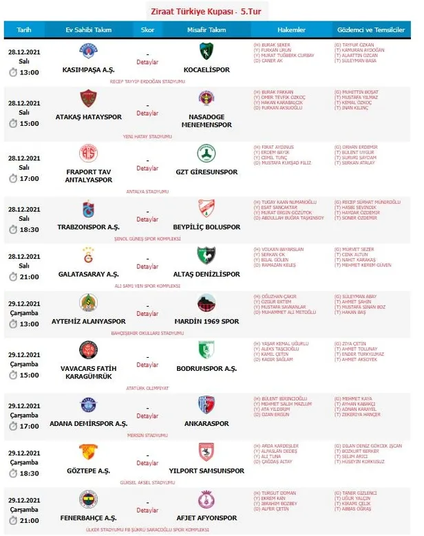Ziraat Türkiye Kupası 5'inci Turu'nda salı ve çarşamba günü oynanacak 10 karşılaşmada görev alacak hakemler belli oldu. Oynanacak karşılaşmalar, başlama saatleri ve görev yapacak hakemler şöyle: