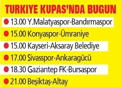 Kupada 5. tur heyecanı bugün sona erecek. Beşiktaş- Altay maçının dışında 5 karşılaşma daha oynanacak ve tur atlayan takımlar netleşecek. Bugün oynanacak tüm maçlar A Spor'dan naklen yayınlanacak.