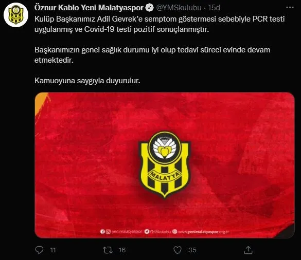 Sarı-siyahlı kulüpten yapılan açıklamada, "Kulüp başkanımız Adil Gevrek'e semptom göstermesi sebebiyle PCR testi uygulanmış ve Kovid-19 testi pozitif sonuçlanmıştır.