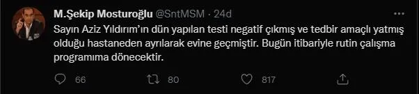 Sosyal medya hesabı üzerinden bilgilendirme yapan Mosturoğlu, koronavirüs testinin pozitif çıkması nedeniyle tedbir amaçlı hastanede olan Aziz Yıldırım'ın son testinin negatif çıktığını ve bugün hastaneden ayrılarak evine geçtiğini belirtti. Mosturoğlu, Aziz Yıldırım'ın bugün itibarıyla rutin çalışma programına döneceğini kaydetti.