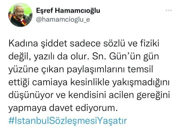 Kadına şiddet sadece sözlü ve fiziki değil, yazılı da olur. Sn. Gün'ün gün yüzüne çıkan paylaşımlarını temsil ettiği camiaya kesinlikle yakışmadığını düşünüyor ve kendisini acilen gereğini yapmaya davet ediyorum.