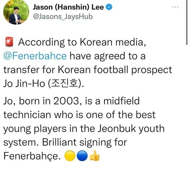 Güney Koreli gazeteci Jason Lee de sosyal medya hesabından Fenerbahçe'nin genç oyuncuyla anlaşmaya vardığını duyurdu. Lee, transferi duyururken, "Muhteşem bir transfer" ifadesini kullandı.