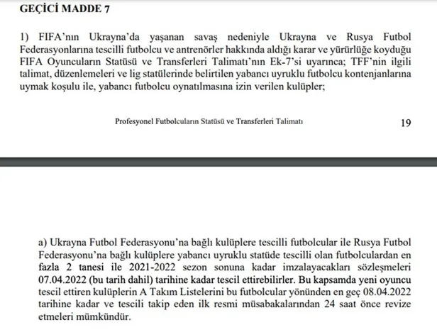 TFF'den yapılan açıklamaya göre talimata eklenen geçici maddeyle kulüpler, Ukrayna ile Rusya Futbol Federasyonlarına bağlı kulüplerde yabancı uyruklu statüde tescilli olan futbolculardan en fazla ikisiyle 2021-2022 sezon sonuna kadar imzalayacakları sözleşmeleri 7 Nisan'a kadar tescil ettirebilecek.