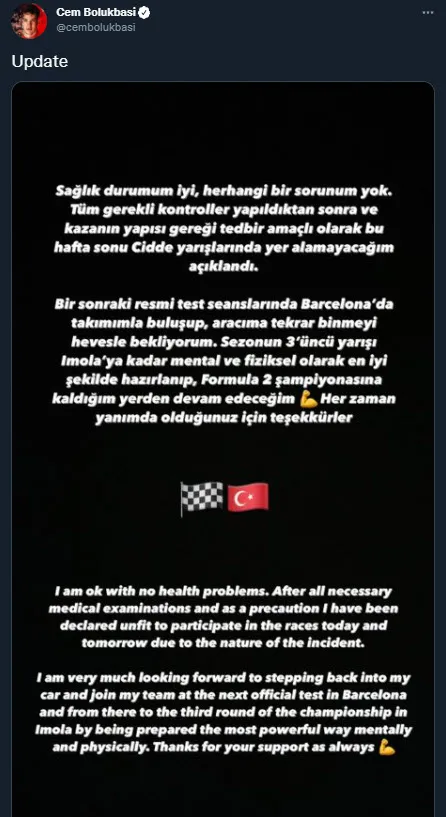 Bir sonraki resmi test seanslarında Barselona'da takımımla buluşup aracıma tekrar binmeyi hevesle bekliyorum. Sezonun 3. yarışı Imola'ya kadar mental ve fiziksel olarak en iyi şekilde hazırlanıp Formula 2 şampiyonasına kaldığım yerden devam edeceğim. Her zaman yanımda olduğunuz için teşekkürler.