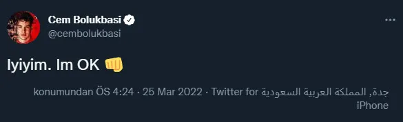 Aracından kendi başına çıkan ve tıbbi araca yürüyebilen Cem Bölükbaşı, kazadan kısa süre sonra sosyal medya hesabından 'İyiyim' şeklinde paylaşım yapıp gönüllere su serpmişti. Kazadan yaklaşık 2 saat sonra, Cem'in kontrol için hastaneye götürüldüğü ortaya çıkmıştı.