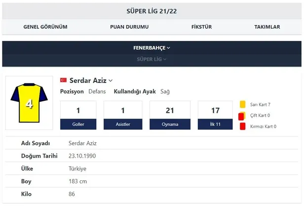 Serdar Aziz'in görev yaptığı maçlarda sadece deplasmanda Başakşehir'e 2-0 yenilen Fenerbahçe'nin kalan 21 maçta ise sırtı yere gelmedi. Sarı-Lacivertliler, 31 yaşındaki futbolcunun forma giydiği 22 maçta 2,31 puan ortalaması yakalayarak çok büyük bir başarıya imza attı.
