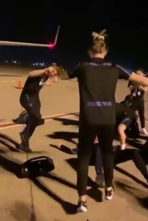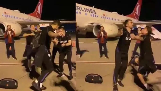 Bordo-mavili kulübün sosyal medya hesaplarından yapılan videolu paylaşımda, oyuncuların Adana Havalimanı'nda uçak önünde kolbastı oynadığı anlara yer verildi.