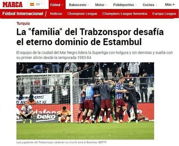 İspanyolların ünlü gazetesi Marca, Trabzonspor ile ilgili yaptığı haberde övgü dolu sözler sarfetti. Marca, "Trabzonspor ailesi, İstanbul'un ebedi egemenliğine meydan okuyor" başlıklı haberinde Bordo-Mavililer'i övücü ifadeler kullandı.