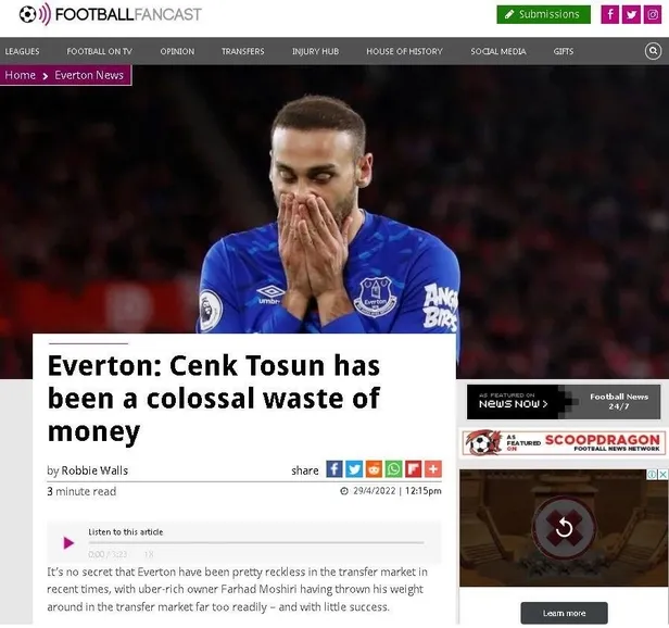 Süper Lig'den bonservis rekoru kırarak 23 milyon Euro karşılığında 2018-2018 sezonun devre arasında Everton'a transfer olan Cenk Tosun'un İngiltere serüveni sakatlıklar sebebiyle bir türlü beklediği gibi geçmedi. Sakatlığı sebebiyle bu sezonu da kapatan ve Everton ile mayıs ayı sonunda sözleşmesi bitecek olan Cenk'in kulübüne toplam maliyeti ise İngiltere'de gündeme oturdu.