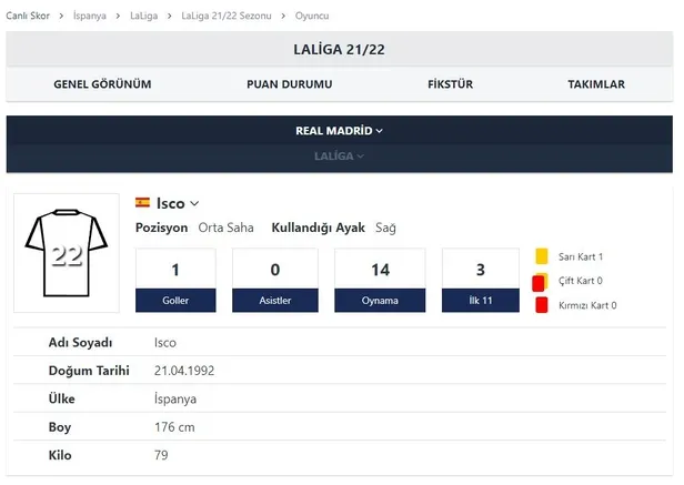 Real Madrid'te 9 yılda tam 353 resmi maça çıkan Isco 53 gol ve 56 asistlik performans sergiledi. Son dönemde gözden düşen ve ilk 11'deki yerini kaybeden yıldız futbolcu bu sezon 17 resmi maçta 407 dakika görev yaparken 2 kez ağları havalandırdı.