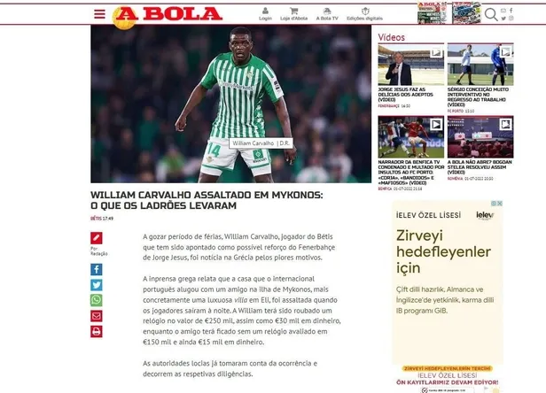 Fenerbahçe'de Jorge Jesus'un ve Galatasaray'da da Okan Buruk'un hocalık koltuğuna oturmasının ardından her iki takımda da transfer çalışmaları son sürat devam ediyor. Bu kapsamda ezeli rakiplerin bir süredir transfer etmek için birbiriyle yarıştığı William Carvalho Yunanistan'da tatil yaptığı esnada kabusu yaşadı. Carvalho'nun binlerce dolarlık eşyaları çalındı.