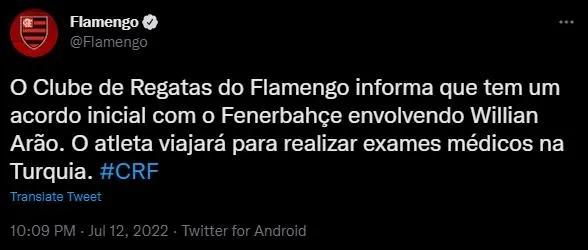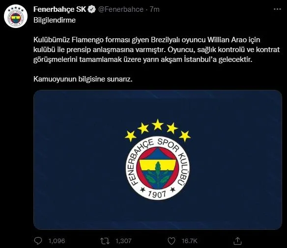 takvim.com.tr geçtiğimiz günlerde Willian Arao'nun Fenerbahçe'ye transfer olacağını duyurmuştu. Yaşananların ardından Arao'nun takımı Flamengo, Fenerbahçe ile anlaşıldığını duyurdu.