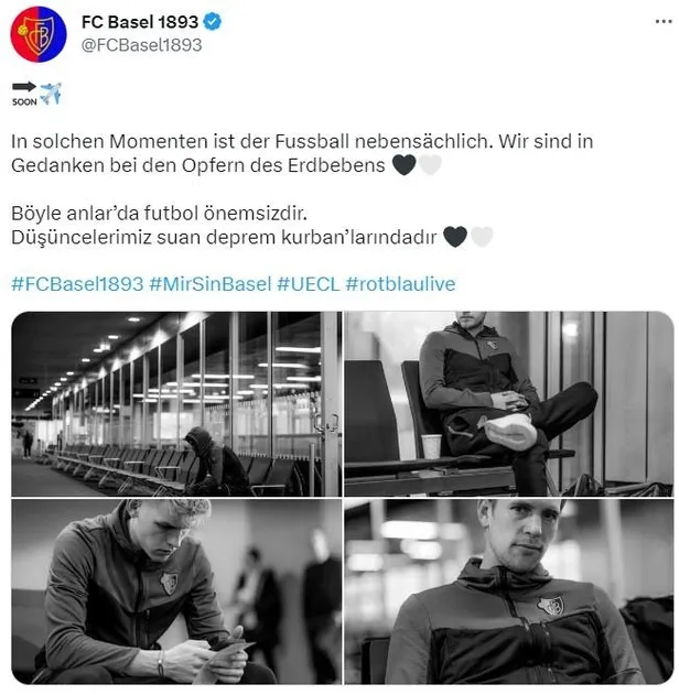 Trabzonspor ile UEFA Avrupa Konferans Ligi Play-Off Turu'nda karşılaşacak olan İsviçre temsilcisi Basel, yaptığı paylaşımda, "Böyle anlarda futbol önemsizdir. Düşüncelerimiz şu an deprem kurbanlarındadır" ifadelerini kullandı.