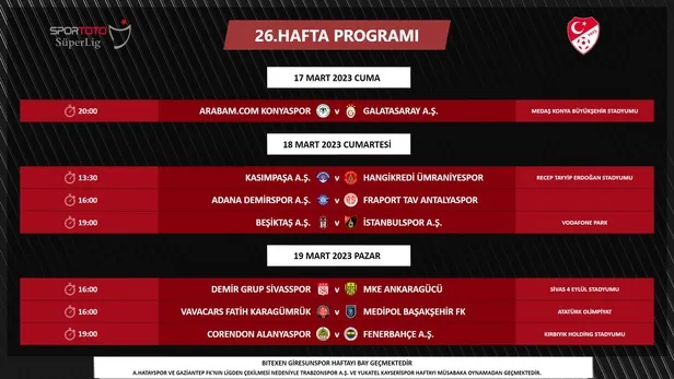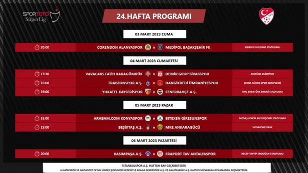 "Asrın felaketi" olarak nitelenen Kahramanmaraş merkezli depremler sonrasında 3 Mart'a kadar ara verilen Spor Toto Süper Lig'de 24, 25 ve 26. haftada oynanacak maçların programı belli oldu.