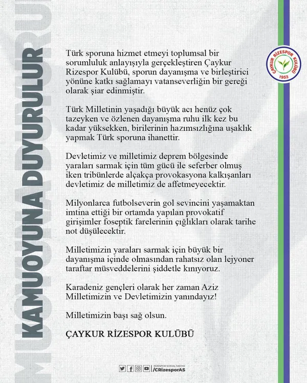 Çaykur Rizespor, "Türk sporuna hizmet etmeyi toplumsal bir sorumluluk anlayışıyla gerçekleştiren Çaykur Rizespor Kulübü, sporun dayanışma ve birleştirici yönüne katkı sağlamayı vatanseverliğin bir gereği olarak şiar edinmiştir." ifadeleriyle yürütülen provokasyon çalışmasına tepki içeren bir açıklamada bulundu.