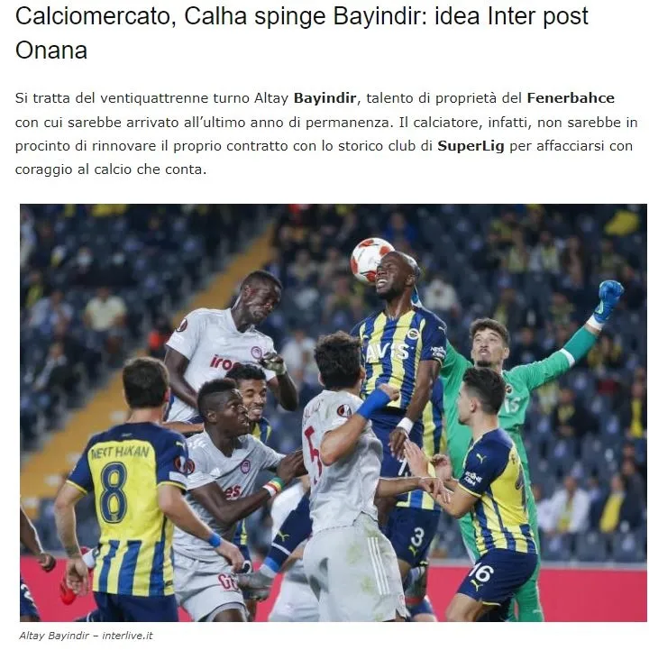 İtalyan basınında yer alan habere göre; Serie A devi Inter, sezon sonunda Fenerbahçe ile sözleşmesi bitecek olan Altay Bayındır'ı renklerine bağlamak istiyor.