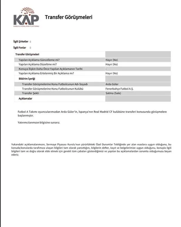 Fenerbahçe, Arda Güler'in Real Madrid'e transferi için görüşmelere başlandığını KAP'a bildirdi. Fenerbahçe'den yapılan açıklamada, "Futbol A Takımı oyuncularımızdan Arda Güler'in, İspanya'nın Real Madrid CF kulübüne transferi konusunda görüşmelere başlanmıştır." ifadelerine yer verildi.