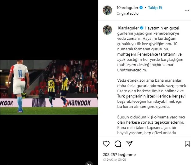 "Veda etmek zor ama bana inananları daha fazla gururlandırmak, vazgeçmek üzere olan herkese ümit olabilmek ve Türk gençlerinin istediklerinde her şeyi başarabileceğini kanıtlayabilmek için bu kararı almam gerekiyordu. Bugün olduğum kişi olmama yardımcı olan herkese sonsuz teşekkür ederim. Bana milli takım kapısını açan, bir hayali yaşatan, hep güzel anılarla hatırlayacağım canım Fenerbahçem, her zaman kalbimde olacaksın. İyi ki Fenerbahçe."