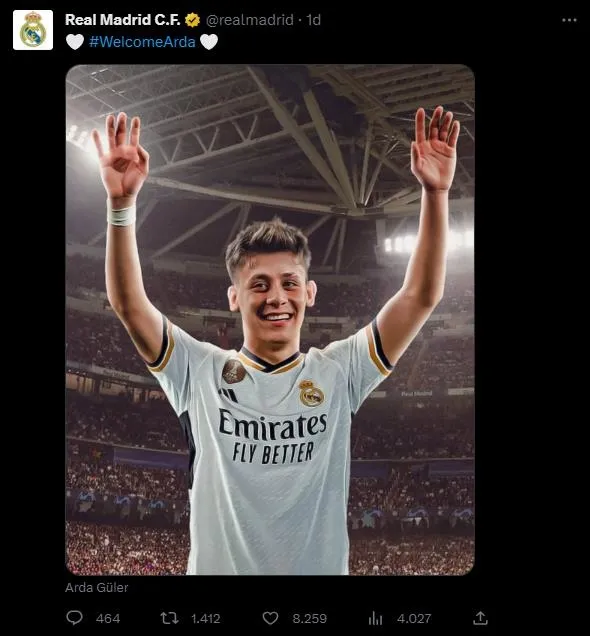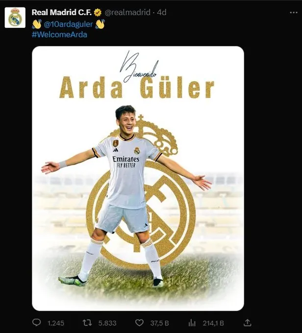 Real Madrid, Arda Güler ile 6 yıllık sözleşme imzalandığını açıkladı. Sosyal medya hesabından Arda Güler'in fotoğrafıı paylaşan İspanyol devi transferi #WelcomeArda etiketi ile duyurdu.