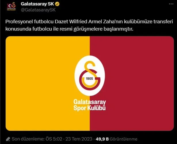 Galatasaray Sportif AŞ'nin Borsa İstanbul'a gönderdiği ve Kamuyu Aydınlatma Platformu'nda da yer alan açıklamada, "Profesyonel futbolcu Dazet Wilfried Armel Zaha'nın kulübümüze transferi konusunda futbolcu ile resmi görüşmelere başlanmıştır." ifadelerine yer verildi.