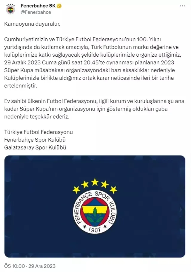 "Kamuoyuna duyurulur, Cumhuriyetimizin ve Türkiye Futbol Federasyonu'nun 100. Yılını yurtdışında da kutlamak amacıyla, Türk Futbolunun marka değerine ve kulüplerimize katkı sağlayacak şekilde kulüplerimizle organize ettiğimiz, 29 Aralık 2023 Cuma günü saat 20.45'te oynanması planlanan 2023 Süper Kupa müsabakası organizasyondaki bazı aksaklıklar nedeniyle Kulüplerimizle birlikte aldığımız ortak karar neticesinde ileri bir tarihe ertelenmiştir. Ev sahibi ülkenin Futbol Federasyonu, ilgili kurum ve kuruluşlarına şu ana kadar Süper Kupa'nın organizasyonu için göstermiş oldukları çaba nedeniyle teşekkür ederiz."