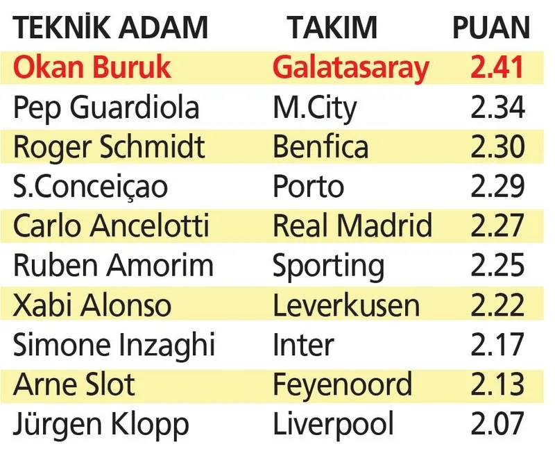 Listenin 4. basamağında Porto'nun Portekizli çalıştırıcısı Sergio Conceiçao (2.29) yer alırken 5. sırada ise 2.27'lik ortalama ile Real Madrid'in İtalyan antrenörü Carlo Ancelotti var.