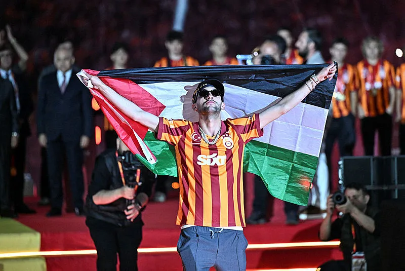 RAMS Park Ali Sami Yen Spor Kompleksi'nde 24. şampiyonluk kutlamaları tüm hızıyla devam ediyor. Galatasaray'ın yıldız futbolcusu Hakim Ziyech Filistin Bayrağı ile sahaya çıktı. Ziyech, Filistin bayrağıyla yıldız oyuncu Kerem Aktürkoğlu ile birlikte de poz verdi.
