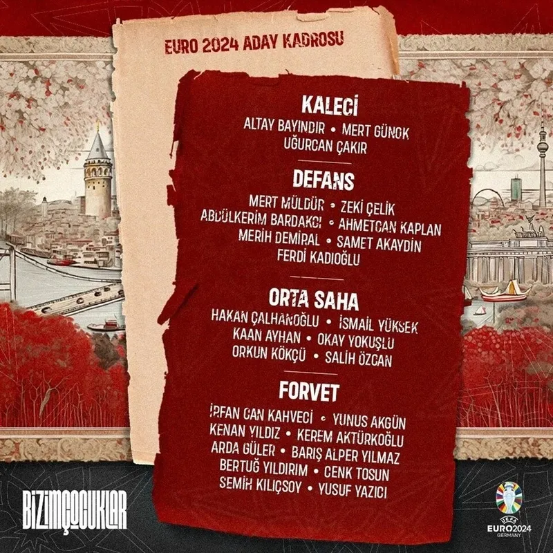 Almanya'nın ev sahipliğinde 14 Haziran-14 Temmuz'da düzenlenecek 2024 Avrupa Futbol Şampiyonası'nda (EURO 2024) mücadele edecek A Milli Takım'ın aday kadrosu belli oldu.