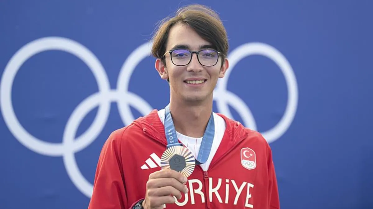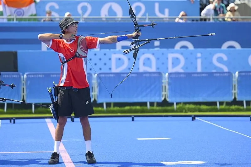 Fransa'da düzenlenen Paris 2024 Olimpiyat Oyunları'nın üçüncü gününde Okçuluk Klasik Yay Takım kategorisinde Çin'i yenen Mete Gazoz (kırmızı solda), Muhammed Abdullah Yıldırmış (kırmızı sağda) ve Ulaş Berkim Tümer'den (kırmızı ortada) oluşan Klasik Yay Erkek Milli Takımı, bronz madalya kazandı. (29 Temmuz 2024)